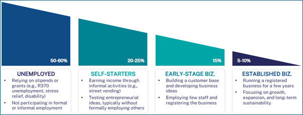 - Side-hustlers, who engage in multiple income-generating activities, switching between them quickly. They focus on short-term opportunities, and generate up to R1,500 profit per month.